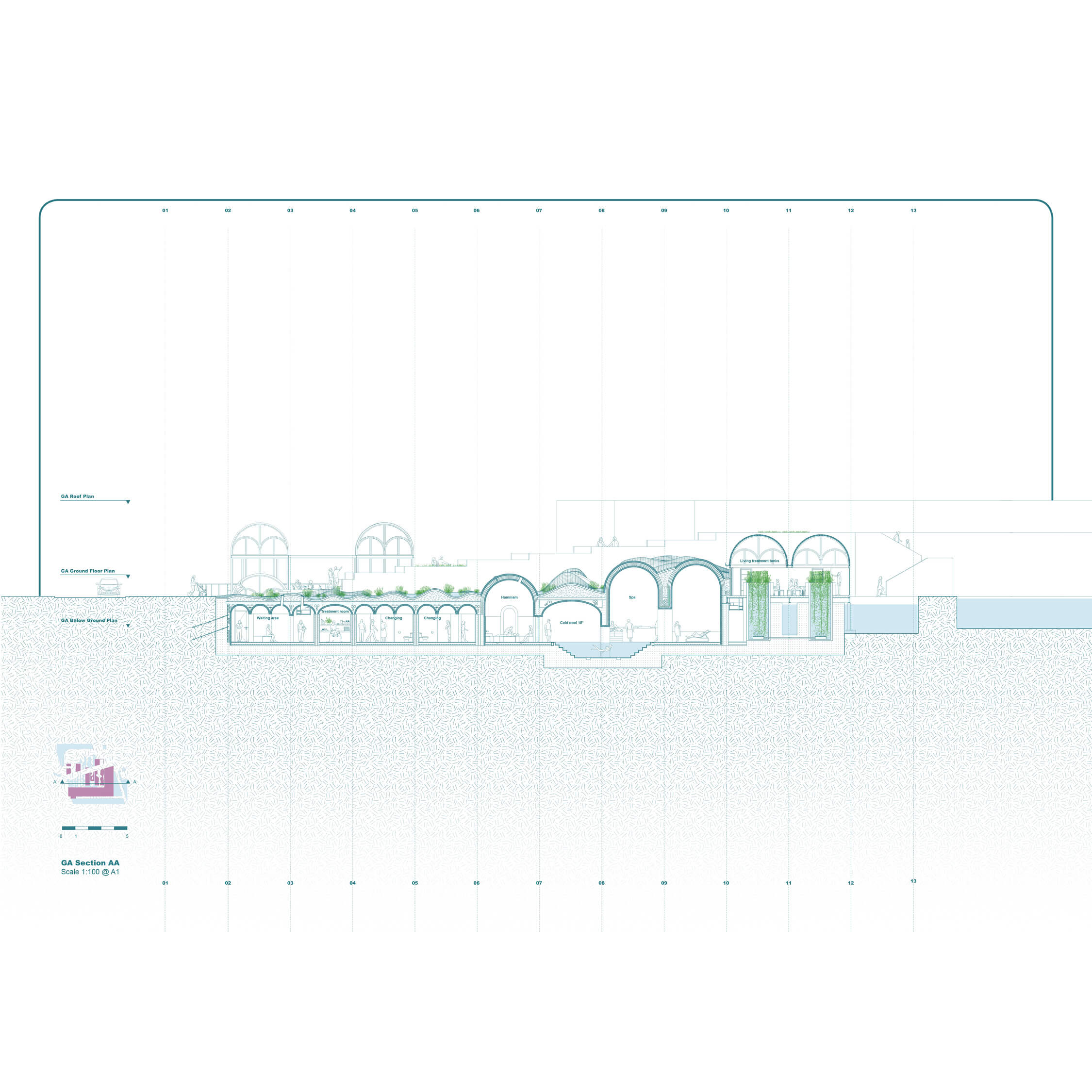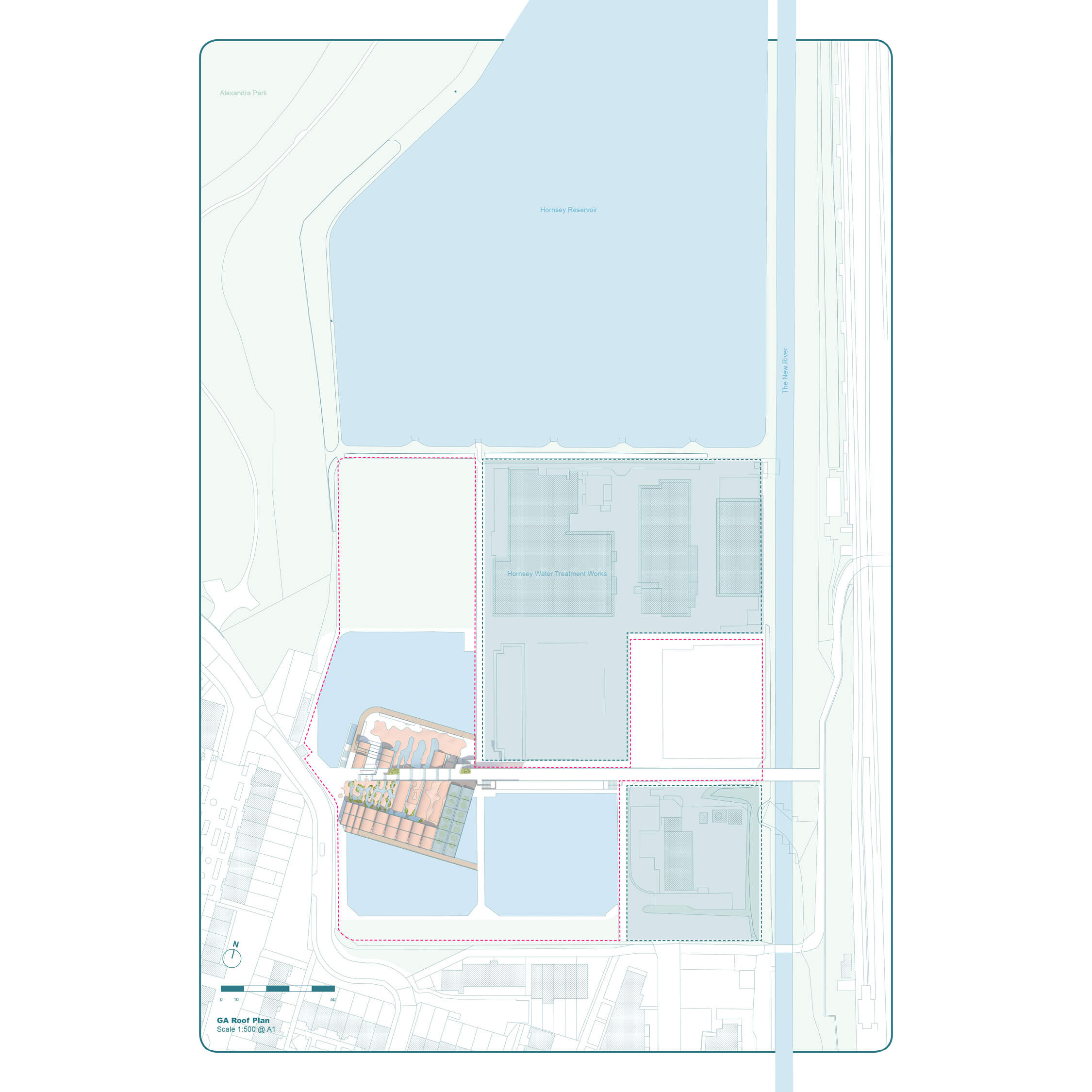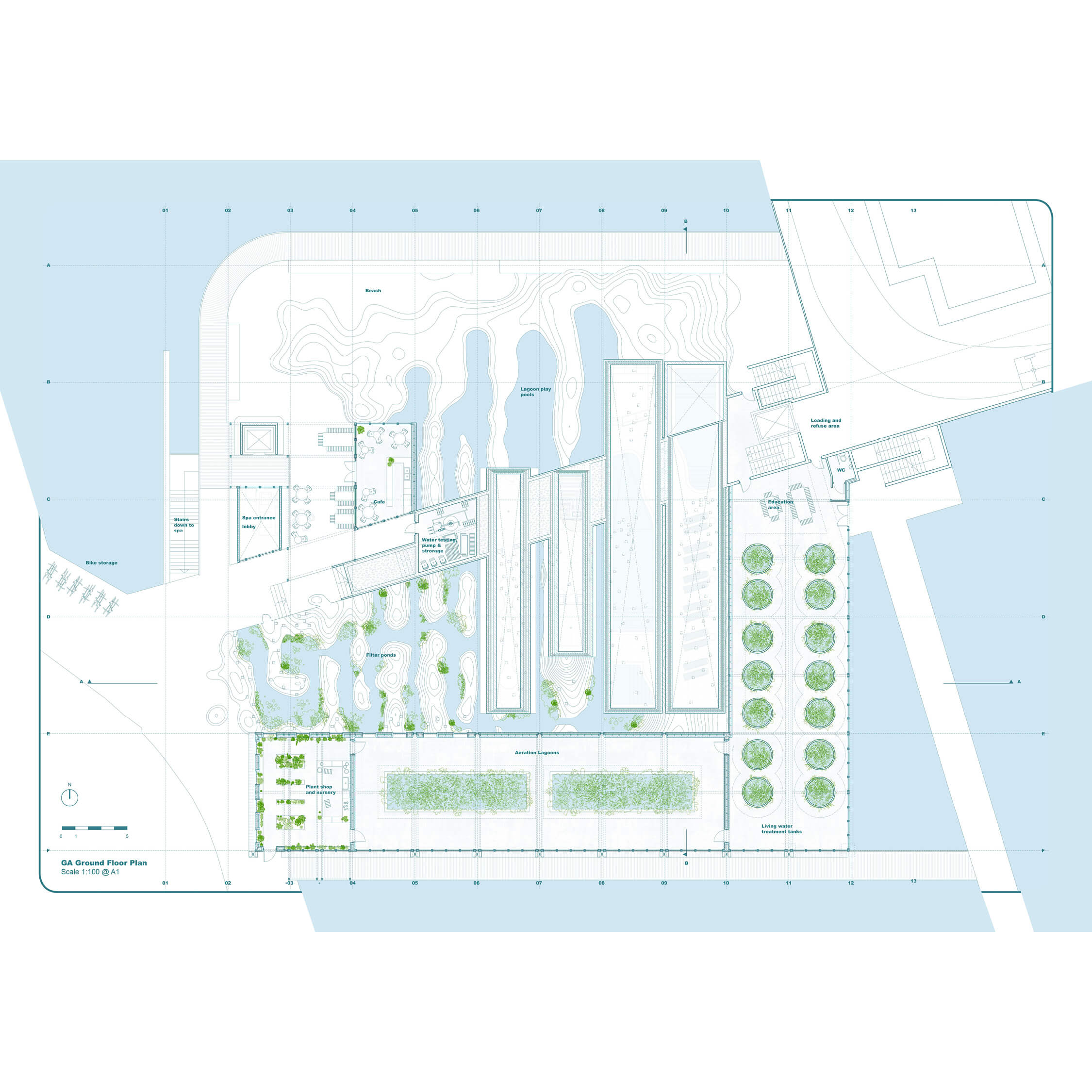 Located in London, South East of Alexandra Park and partially submerged into the landscape of the redundant filter bedsat Hornsey Water Treatment Works. The building proposal forms part of a wider masterplan for a community centredaround sustainable water use and awareness. An underground thermal spa forms the heart of the proposal, providing aspace that promotes health, well-being and positive relationships to water. All of the grey water produced by the spa isprocessed and reused on site, using a living, non-chemical, wastewater treatment system that creates a closedhydrological loop with the adjacent water works.